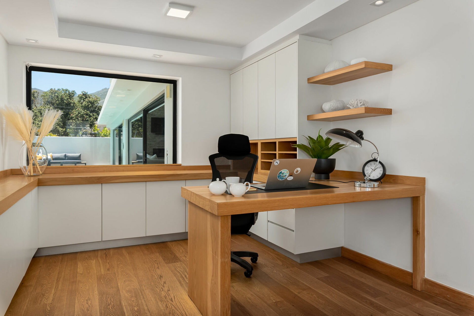 Office with desk, 4-seater table, and doors leading to the front garden with a 6-seater table