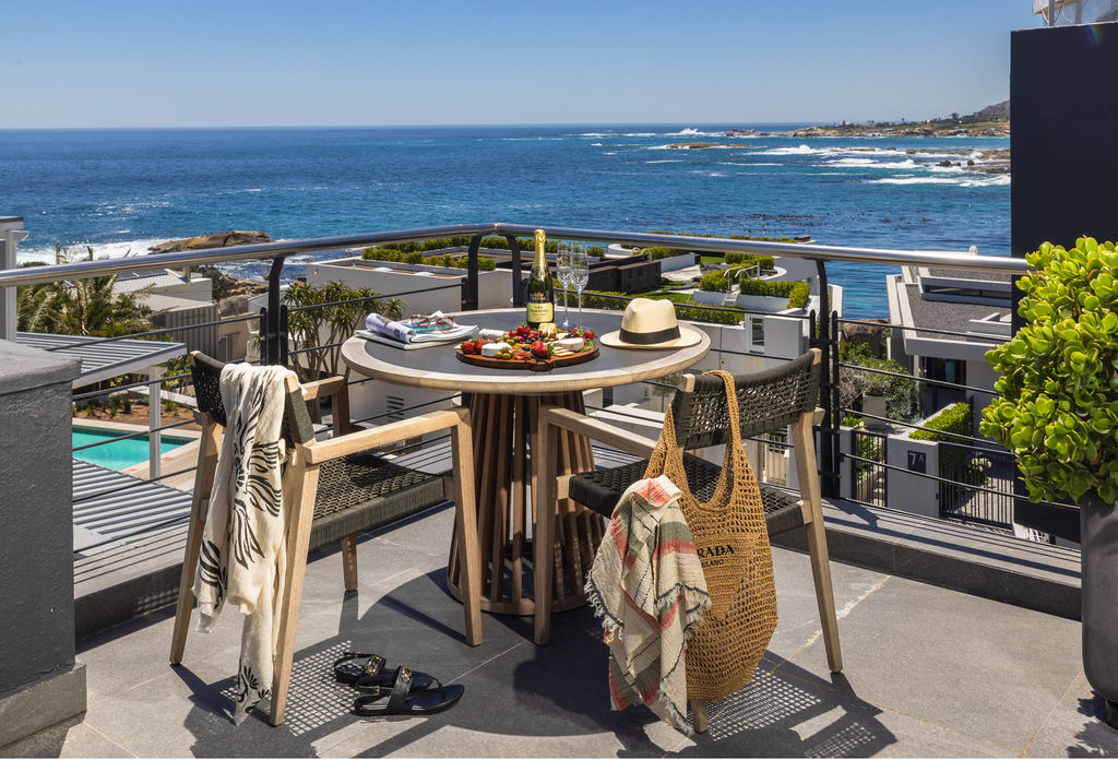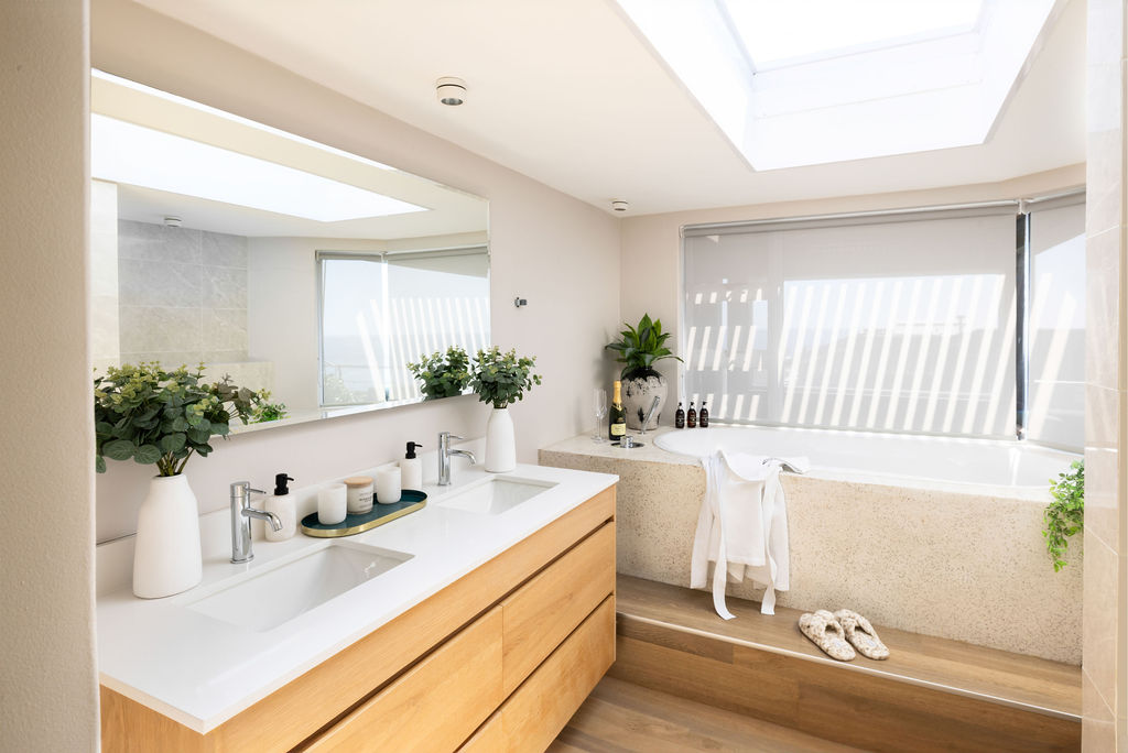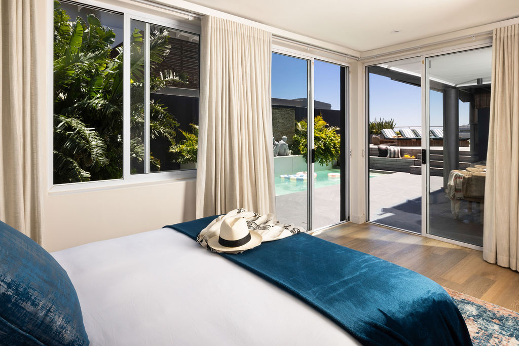 Master Bedroom – King size bed (can be made up as twins on request), air-con, 63-inch Smart TV, digital safe, ensuite bathroom with bath, shower and double vanity, terrace with daybed, patio table and 2 chairs, sea views