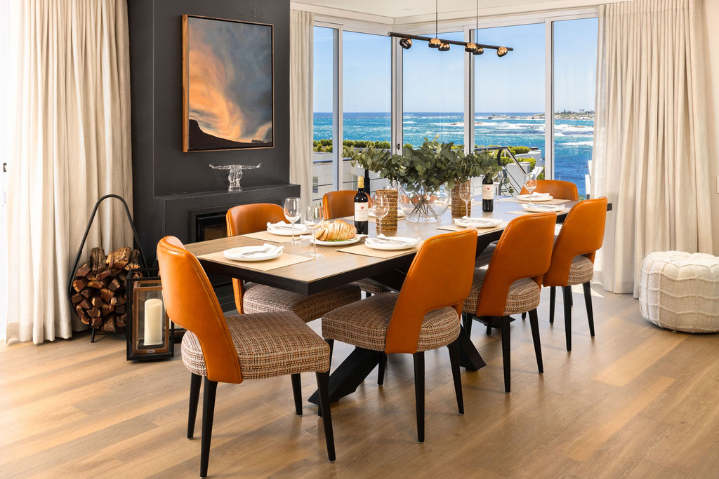 - Open plan dining area with 10-seater dining table and wood-burning fireplace, sliding door leads to pool and patio, Sea views