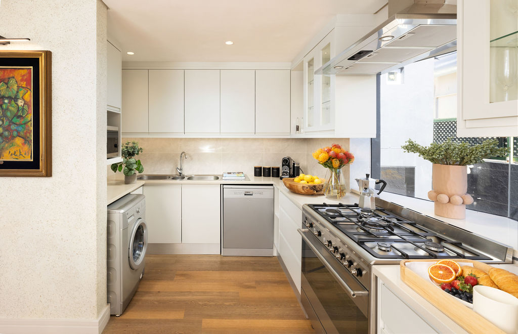 - Open plan kitchen with gas hob, electric oven, Nespresso machine, kettle, toaster, dishwasher, washing machine, microwave, and double door fridge. (tumble dryer in garage).
