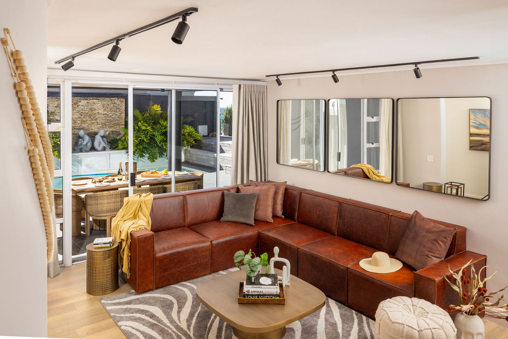 - Lounge open plan with 63-inch Smart TV and large L-shaped couch, sliding door leads to pool and patio